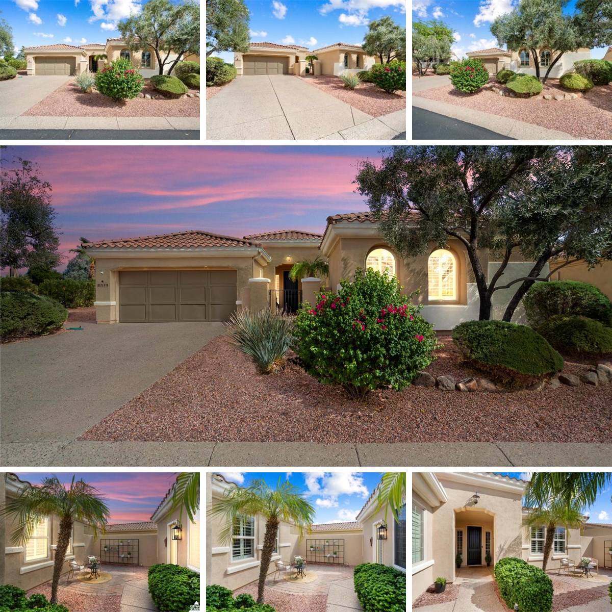 Montecito Floorplan & Casita w/meditating sky-line Golf Course & Mountain Views, this beautifully updated home is ideally situated on the 7th Fairway of Corte Bella Country Club. Designed w/a versatile casita, the property combines style, comfort, and functionality. Key Features & Upgrades: Recent Improvements (2025): New roof underlayment, HVAC system, and water heater. •Remodeled Kitchen: White cabinetry, Quartz countertops, glass tile backsplash, center island, recessed lighting, and stainless-steel appliances including gas range (approx. 2022). •Flooring: 18'' tile in main living areas, luxury vinyl plank in bedrooms and casita/hobby room. •Plantation shutters throughout, updated lighting in great room, built-in shelving at entertainment center. "Ceiling fans in every room. "Casita/Hobby Room: Separate AC, French door access from courtyard, walk-in closet, luxury vinyl plank flooring & ceiling fan. "Garage: Extended 2-car with epoxy flooring (approx. 2022), built-in cabinets, work area, and utility sink. "Courtyard: Gated with 4' wall and paver design. "Primary Suite: Bay window with golf course views, dual sinks, walk-in closet, updated lighting. "Outdoor Living: Extended covered patio with BBQ, firepit, and manicured landscaping framing spectacular sunrise and skyline views. With its thoughtful upgrades, versatile casita, and prime golf course setting, this home offers a refined resort-style living experience in one of the most desirable communities.